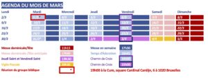 En semaine : les mardis, mercredis, jeudis et vendredi, il y aura un temps d’adoration eucharistique de 17h00 à 17h30, suivi d’une messe à 17h30.